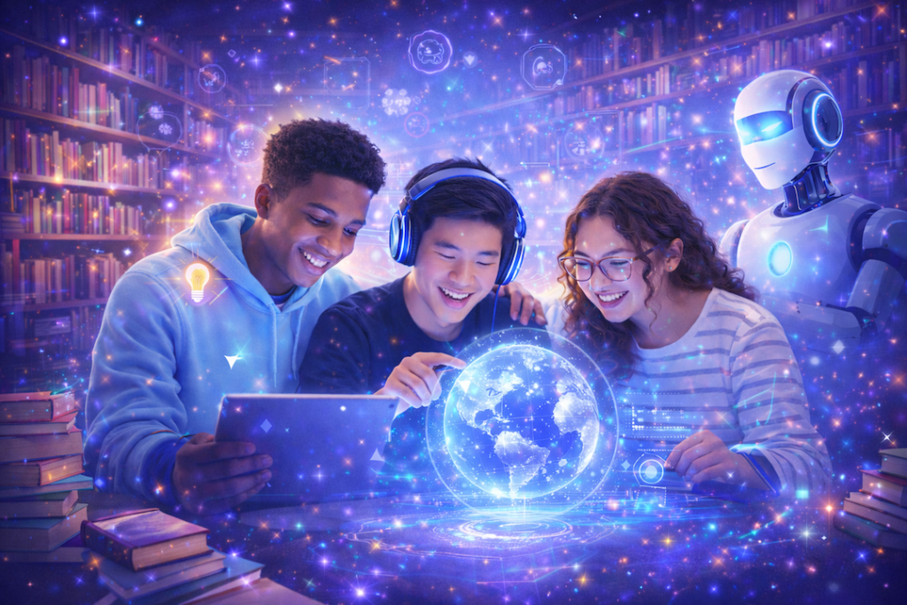 A blog article, Instagram posts, and a newsletter engage Gen Alpha and young Gen Z audiences, encouraging curiosity about AI and inviting communities to explore free Gemini AI Labs at the Los Angeles Public Library.